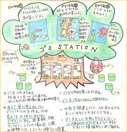 このECOステーションは、2021年に豊島区後援のもと「ごみを正しく・楽しく分別できる」をテーマに小中学生からアイデアを募り、約500件のアイデアが集まった「ECOアイデアコンテスト」の受賞アイデア*を活かして開発したもので、サンシャインシティ賞を受賞した大西凛さん(小6)のアイデアをメインに、他の受賞アイデアも一部取り入れながらひとつのカタチになっています。