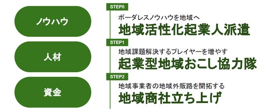 - ボーダレス・ジャパンの社員が「地域活性化起業人」として現地に常駐し、3年間かけて自立可能な地域モデルを構築