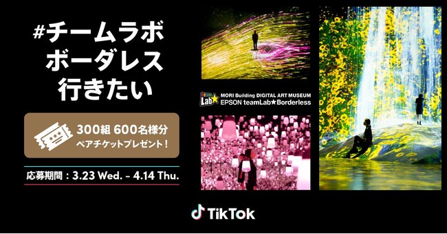 ショートムービープラットフォーム「TikTok(ティックトック)」では、3月23日(水)より4月14日(木)まで、東京・お台場の「森ビル デジタルアート ミュージアム:エプソン チームラボボーダレス(以下、チームラボボーダレス)」のペアチケットが抽選で300組(600名様分)に当たる、「#チームラボボーダレス行きたい」ペアチケットプレゼントキャンペーンを開催中です。