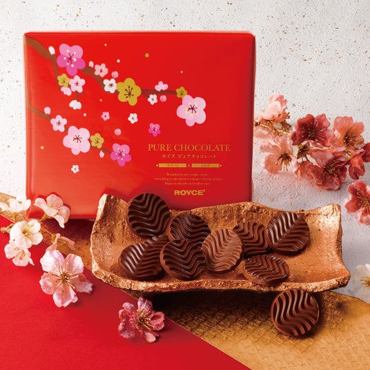 酸味と苦みが調和したすっきりとしたおいしさが特長の[スイート]と、カカオとミルクの味わいを生かしバランスよくまろやかに仕上げた[ミルク]の2種類のおいしさを楽しめる「ピュアチョコレート[スイート&ミルク]」。梅の二枝を描いたお正月らしい包装紙で包みました。