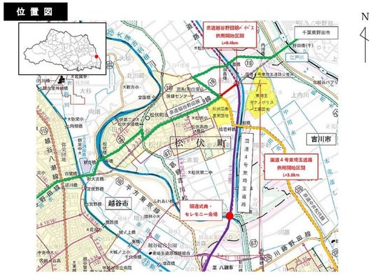 開通に先立ち、開通式典・セレモニーを開催します。 また、国道4号東埼玉道路の開通に合わせ、県が整備を進めている、主要地方道越谷野田線バイパスの一部区間の供用を開始します。