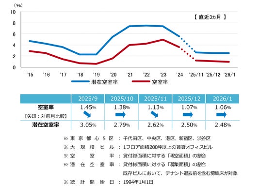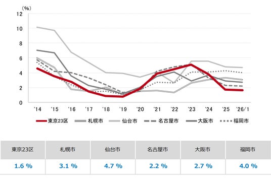 三幸エステート株式会社(本社:東京都中央区、取締役社長:福島正二郎)は、2026年1月度の東京都心5区(千代田区、中央区、港区、新宿区、渋谷区)および全国6大都市(東京、札幌、仙台、名古屋、大阪、福岡)の大規模ビル※1のマーケットデータをまとめた「オフィスマーケット2026年2月号」を公表します。