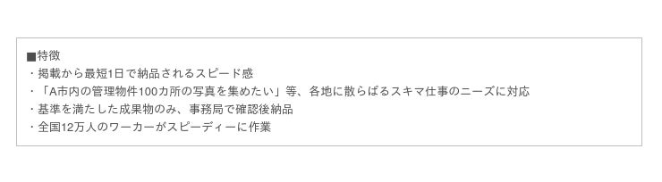 『ご近所ワークlite』は、家の近所や外出先のスキマ時間に、ちょっとした仕事をしてポイントを稼ぐ無料のスマホアプリです。企業様はわざわざ現場に足を運ばなくても、現地の人にちょっとした撮影や調査などの作業を依頼できます。