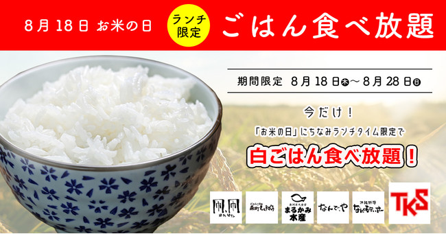 8月18日は「お米の日」です。米という字は八・十・八の字からできており、それに因んで8月18日がお米の日となったと言われています。ティーケーエスではこのお米の日から10日間限定で、直営5業態 12店舗にて ランチ限定「ごはん食べ放題」を実施いたします。