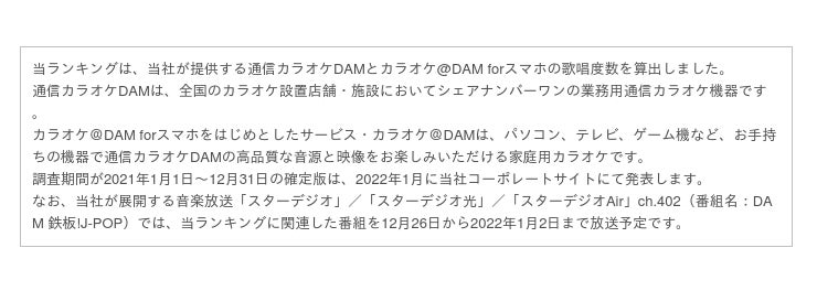 通信カラオケDAM 2021年年間カラオケランキング(部門別)