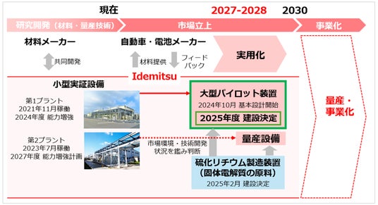 現在稼働する2基の小型実証設備において、固体電解質の量産技術開発とサンプルの製造を実施しています。第1プラントでは主にトヨタ向けの固体電解質を、第2プラントでは異なる種類の固体電解質を開発しています。このたび、第1プラントで得られた実証結果を踏まえ、事業化に向けた次期フェーズである大型パイロット装置の建設を決定しました。生産能力は年間数百トンを見込んでいます。当社の千葉事業所(千葉県市原市)敷地内に2027年中の完工を目指します。なお、本装置の建設工事は千代田化工建設株式会社に発注しています。