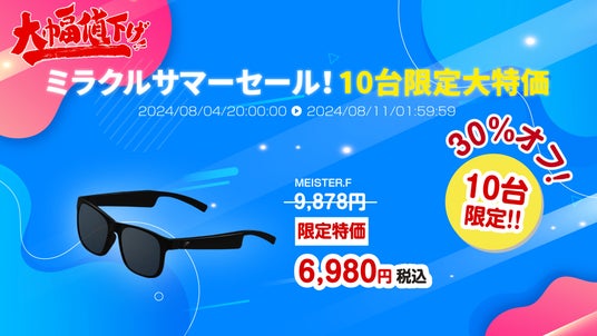楽天「Show!t」は、8月4日20:00~8月11日1:59まで開催の楽天お買い物マラソンに参加し、オーディオサングラスを10台限定30%オフで販売します。オーディオサングラスは、周囲の環境音を聞きながら音楽や通話、ナビが楽しめ、電動キックボードとの併用に便利です。