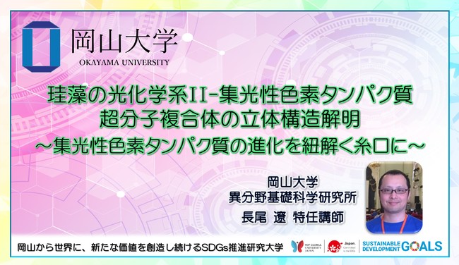 国立大学法人岡山大学(本部:岡山市北区、学長:槇野博史)異分野基礎科学研究所の長尾遼特任講師、加藤公児特任准教授、沈建仁教授、神戸大学大学院理学研究科の秋本誠志准教授らの共同研究グループは、京都大学の伊福健太郎教授らとの共同研究により、クライオ電子顕微鏡を用いて、珪藻の光化学系II-フコキサンチンクロロフィルタンパク質II超分子複合体(PSII-FCPII)の立体構造解析に成功しました。PSII-FCPII構造の空間分解能が向上した結果、PSIIに結合する全てのFCP遺伝子を同定し、より正確な色素配置を明らかにしました。