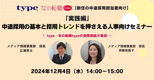 転職サイト「type」では、12/4(水)14時より、「【新任の中途採用担当者向け】「実践編」中途採用の基本と採用トレンドを押さえる人事向けセミナー」を開催いたします。