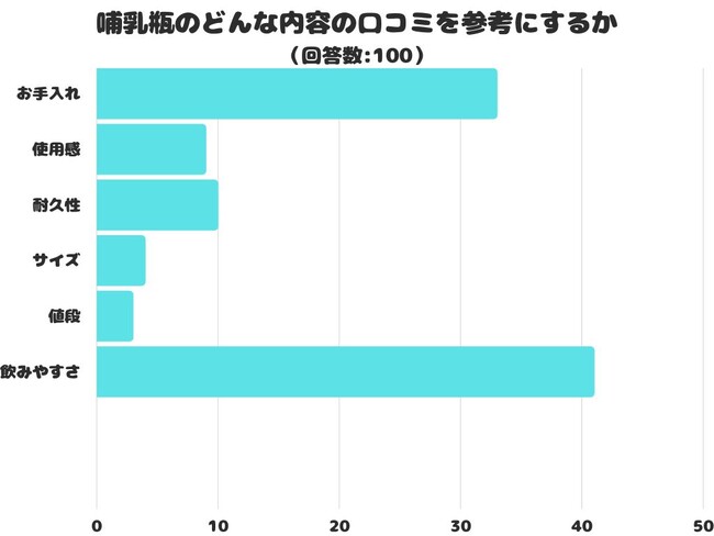 哺乳瓶のどんな内容の口コミを参考にするかをアンケートにて調査したところ、1位は「飲みやすさ」でした。