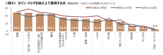 女性は「デザイン・見た目」が最も高く、男性と比べ「軽さ」「素材・質感」「カラー」「ポケットの数」なども重視している。<図4>
