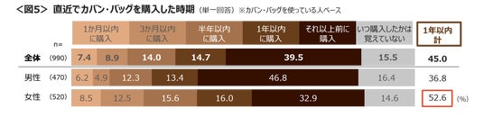 直近でカバン・バッグを購入したのは、「1年より前」が39.5%で最も多い。
