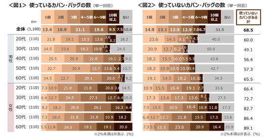 女性50~60代は「10個以上」持っている人が2割前後と保有数は多いが、使っていないカバンの数も多い。男性30代は使っていないカバンが少ない。<図1・図2>