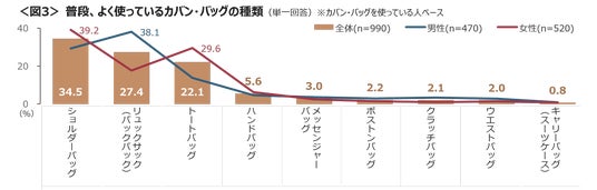 男性は「リュックサック(バックパック)」、女性は「ショルダーバッグ」が1位。<図3>