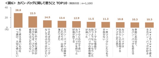 カバン・バッグに関して思うことは、「長く使える良いものを一つ選び、大切に使いたい」「収納しやすく持ち運びがラクならば、ブランドや価格にはこだわらない」が2割台で上位。「できればカバン・バッグなしで手ぶらで出かけたい」は3番手の14.5%。<図6>