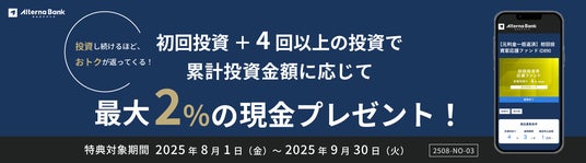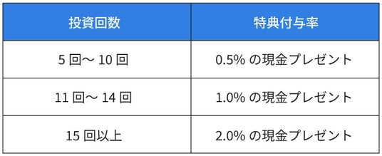 2025年8月1日(金)~2025年9月30日(火)の期間中、オルタナバンクで初回投資を行い、さらに期間中に運用が開始されたファンドへ4回以上の投資をされた方を対象に、累計投資金額に応じて最大2%の現金をプレゼントいたします。期間中の投資回数に応じて特典付与率が変わります。