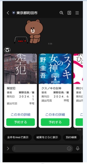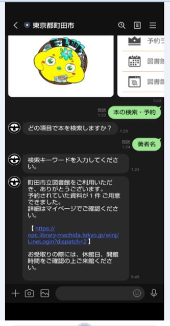 - LINEからマイページへログインができます。また、トーク画面上で、本の検索・予約・予約した本の用意ができた際のお知らせも受け取れます。