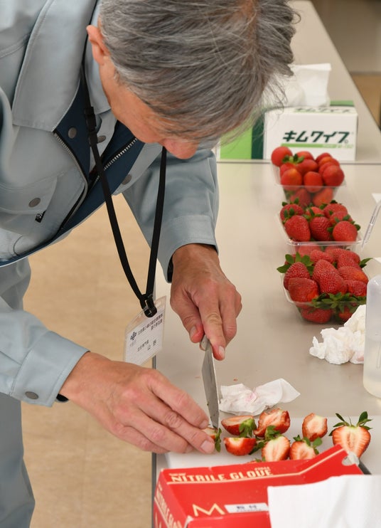 この日は市内の栽培農家12軒が、それぞれ選りすぐりのイチゴを出品し、品評会会場には甘い香りが立ち込めました。一次審査で、形、色つや、粒のそろい具合などから3点に絞られた後、包丁でイチゴを縦半分に切り、糖度計を使って糖度を測定。優秀賞に向井栄三さん(同市土室町)が選ばれました。審査員を務めた大阪府北部農と緑の総合事務所主任専門員の山野さんは「入賞したイチゴは、粒のそろい、見た目、糖度ともに素晴らしいものでした」と評価し、「これからも引き続き地元の特産品である露地イチゴを作り続けてください」と期待を寄せていました。