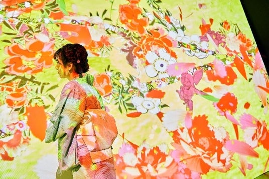 「動き出す浮世絵展 TOKYO」は着物で楽しめる特別な展覧会です!伝統と現代が融合する会場では、美しい着物をまとってデジタル映像と合わせて写真を撮るなど特別な一日を過ごすことができます。さらに、TOKYO展では着物姿でご来場頂いたお客様に割引のキャンペーンを実施します。お友達やご家族と一緒に、和装でぜひ展覧会にご来場ください。