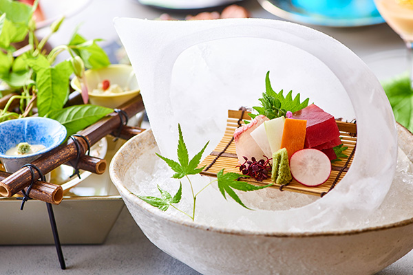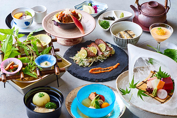 繊細な味付けや季節感溢れる盛り付けがお楽しみいただける会席料理を月替わりでご用意いたします。7月のメニューで目を引く“朝顔盛り”は、朝顔のつるが巻き付いていく様を表現し、夏らしい食材を使った7種が盛り付けられた季節を感じる先付けです。焼物では合鴨のロース肉をじっくりと低温で焼き上げ、硬くならないようやわらかく仕上げました。8月は鰻や旬のすずきなどを使ったスタミナのつくラインナップで、“鰻の柳川鍋”は山椒のピリっとした辛さが料理を引き立てます。7月8月ともに「花むさし」の夏の定番ともいえる氷細工の器に造りを盛り付けた“氷室盛り”をご提供します。暑さを忘れ涼やかなディナータイムをお過ごしください。