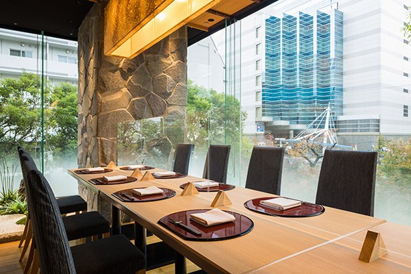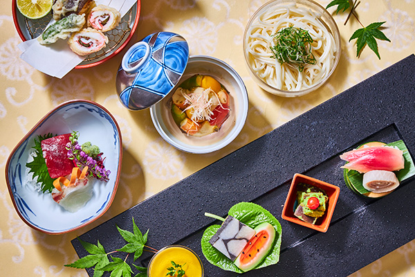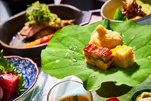 目にも可愛らしいスイカに見立てた小メロンは、赤ワイン漬けにしたヤマモモから抽出したゼリーと一緒に食感も楽しめる一品。さいの目に切った小芋が石垣に見えることから“石垣芋”など料理長のセンスあふれる前菜。御椀は夏らしく冷製で生海苔の磯の香りを感じながらさっぱりと、お食事の“半田素麺”はのど越しもよく、食欲がなくても軽くお召し上がりいただけるよう考えられた爽やかな会席料理をご案内します。