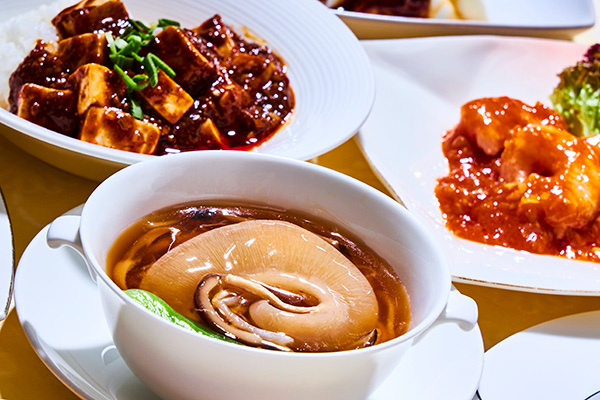 四川料理特有の辛み、甘み、塩味、酸味、苦味それぞれが際立つ五味を存分に味わっていただける全8品をご用意しました。四川省で採れる太くて丸い形が特徴の朝天唐辛子を使った“牛ロースとパパイヤ 四川唐辛子炒め”は辛さと相性の良いフルーツにパパイヤを使い酸味とのマリアージュがたまらない一品です。そのほか、“ふかひれ辛味姿煮 蒸し湯葉添え”や“ロブスターテール チリソース煮”、“四川スモークダック 蒸しパン添え”など高級食材が登場します。
