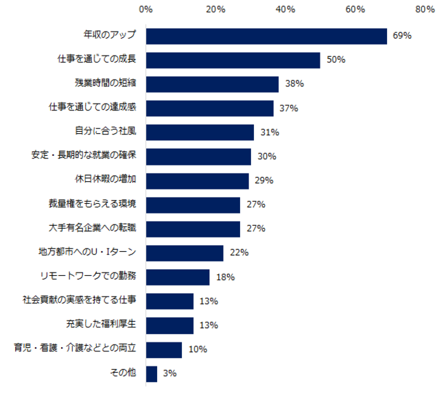 転職成功者が転職で叶えたことを伺ったところ、第1位は「年収アップ」(69%)でした。次いで、「仕事を通じた成長」(50%)が続きます。