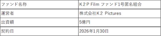 東急不動産ホールディングス株式会社(東京都渋谷区、代表取締役社長:西川 弘典、以下「当社」)は、株式会社K2 Pictures(東京都目黒区、代表取締役 CEO紀伊宗之、以下「K2 Pictures」)が運用する映画製作ファンド「K2P Film ファンド1号匿名組合」(以下、「本ファンド」)に5億円を出資したことをお知らせします。