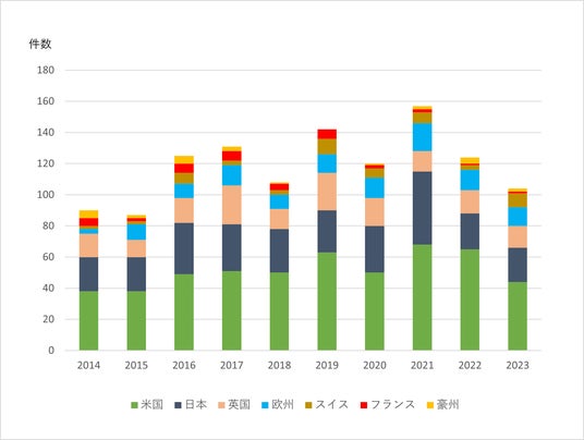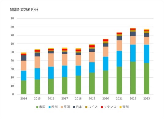 件数では米国、日本、英国の3か国で8割以上を占めるのに対し、配賦額では日本にかわり欧州が入り、米国、英国の3か国/地域で同じく全体の8割超を占めました。配賦額の推移をみると2018年まではほぼ横ばいですが、2019年以降は米国・欧州で増加傾向がつづいています。日本と欧州の順位が件数と配賦額で入れかわった背景として、日本のグラントが他国と比較して短期間かつ少額であるのに対し、欧州は少数ながら大型のグラントが中心となっている特徴があげられます。