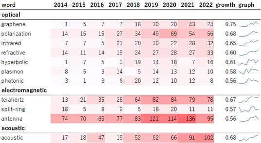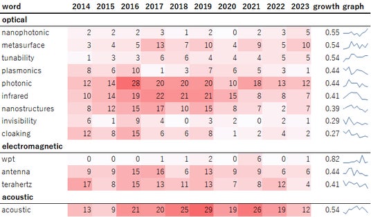 成長率(growth)は、2014年以降の文献中における出現回数と、2019年以降の文献中における出現回数の比で定義されます。値が1に近いほど直近の出現頻度が高いキーワードとなります。図1では前述した3つの対象領域である、光領域(optical)・電波領域(electromagnetic)・音波領域(acoustic)にキーワードをわけ、成長率の高い順にしめしています。光の領域では一般的な光学用語とはことなるグラフェン(graphene)とハイパボリック(hyperbolic)の出現がふえています。