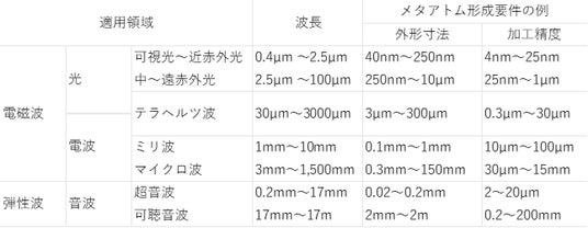 メタマテリアルで波動の伝搬を設計どおり制御するには、波動波長の1/10程度の大きさのメタアトムを、さらに1/10程度の加工精度で形成し、配置する必要があります。上記の分類表では適用領域ごとの波長と、必要となるメタアトムの外形寸法と加工精度の例を記載しました。波長の短い可視光~近赤外光領域では最先端の半導体集積回路と同程度の微細加工技術が必要であり、高いハードルになっています。一方で波長の長い中~遠赤外線や電波、音波では要求される加工精度は比較的ゆるく、実用化が先行しやすい領域であることがわかります。冒頭で紹介した透明マントの例にあるように、電波の領域で実証できても光の領域ではむずかしい理由は、光の波長に対応したメタアトムの作製のむずかしさがあります。