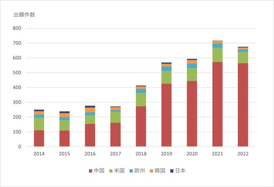 国別では中国の出願件数が圧倒的に多く、米国、欧州、韓国、日本がこれにつづきます。中国では国家政策によりテラヘルツ通信などの研究開発と応用を強化する中国科学技術イノベーション第13次五カ年計画が2016年に始まり、その後の2018年以降の伸びがいちじるしく、2020年代からは中国の出願数が全体の8割程度となっています。中国以外からの出願は一定件数を維持して推移しています。