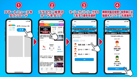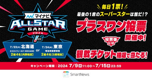 マイナビオールスターゲーム2024では、ファン投票、選手間投票、監督選抜の各枠で出場選手が決定した後に、各選出方法で選ばれていない選手の中から、セ・パ両リーグ1選手ずつ、合計2選手を再びファン投票で選ぶ「プラスワン投票」が実施されます。昨年に引き続き、SmartNews野球チャンネルで投票を受け付けます。投票期間は7月9日(火)から15日(月)までで、この期間中、1日1回セ・パ両リーグの各1選手に投票が可能です。各リーグで得票数の最も多い選手が、夢の球宴の舞台に上がります。
