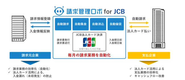そのような中で、JCBでは法人クレジットカードの提供を通して、支払の側面から、企業における経理業務の効率化やキャッシュフローの明確化を支援してまいりました。同様に、ROBOT PAYMENTでは、カード決済と連携した請求管理システム「請求管理ロボ」を通して、請求の側面から、経理業務の効率化と売上の回収を支えています。