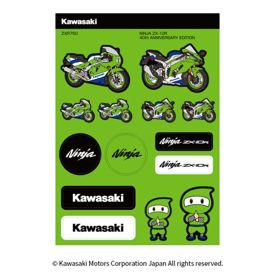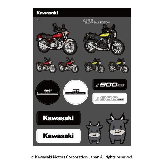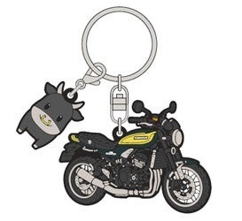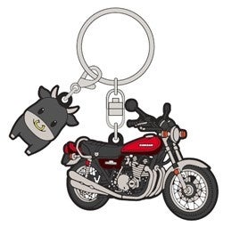 カワサキチャーム付きラバーキーホルダー4種とステッカーセット2種をラインナップ。Ninja ZX-10RとZXRには忍者、Z900RSとZ1には牛のキャラクターがそれぞれセットになっています。忍者はモデル名のNinja、牛はZ1の開発段階からの別称「ニューヨークステーキ」がそれぞれ由来しています。
