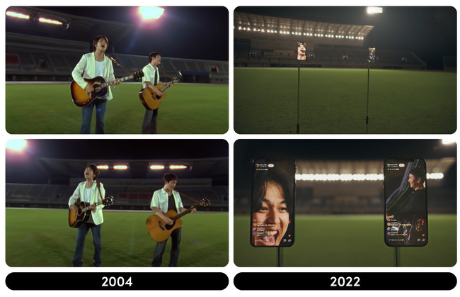 本日より放映する特別映像では、2004年にリリースされた「栄光の架橋」のMVの光景が、2022年のTikTok LIVEバージョンに変化しています。なんと、スタジアムの中心で歌うゆずのふたりが、スマートフォンのTikTok LIVEの中に!スマートフォン画面では、TikTok LIVEでゆずのふたりが歌っている映像が映っています。