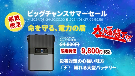 楽天市場「Show !t」は、8月24日20:00~8月27日09:59の楽天お買い物マラソンに参加します。緊急の電力制限、災害時に役立つポータブル電源で、電動キックボード充電にも最適。数量限定、15,000円引きの60%オフで販売しますので、この機会をお見逃しなく。