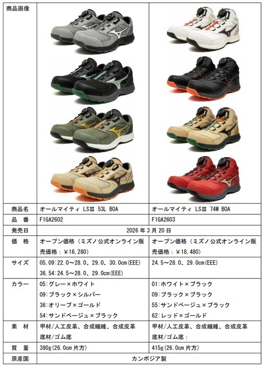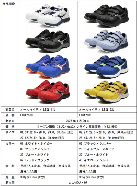 ミズノは、運輸業・建設業・製造業などで働く現場作業者向けのワークシューズ「オールマイティ LSIII(エルエススリー)」シリーズ※1を、ミズノワーク品を取り扱う全国の作業用品専門店やホームセンター、ミズノ公式オンラインで1月20日に2機種、3月20日に2機種発売します。