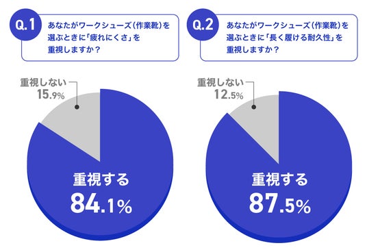 日頃ワークシューズを履いて仕事をしている就業者を対象に、ワークシューズ購入時の選び方に関する調査※3を実施しました。その結果、疲れにくさを重視すると回答した人は84.1%、長く履ける耐久性を重視すると回答した人は87.5%となりました。