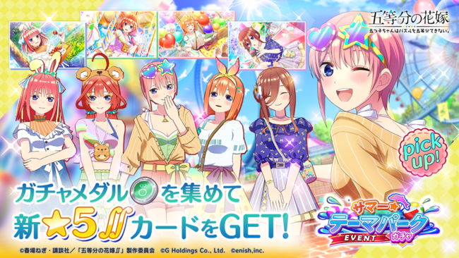 株式会社enish(本社:東京都港区、代表取締役社長:安徳 孝平、以下enish)は、2022年8月19日(金)より、アニメ「五等分の花嫁」初となるゲームアプリ『五等分の花嫁 五つ子ちゃんはパズルを五等分できない。』にて、週刊少年マガジン編集部完全監修のゲームオリジナルストーリーをフルボイスでお楽しみいただける新イベント「五つ子ちゃんとスプラッシュパレード~水に濡れてはしゃいじゃおう!~」を開催いたします。
