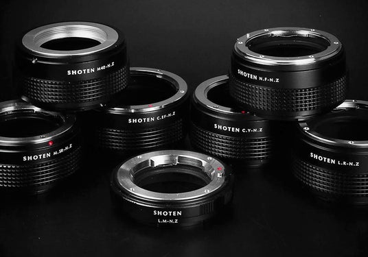 SHOTEN マウントアダプター Zボディー用 シリーズニコンF、M42、ライカRなどのレンズをニコンZマウント機で使用できるマウントアダプターシリーズです。真鍮パーツと金属ボディにより、高精度かつ高耐久を実現。内面反射を抑える艶消し加工により、快適な撮影をサポートします。