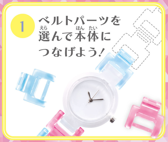 腕時計は、好きなベルトパーツ、フレーム、デザインフィルム、デコパーツを選んで時計本体につけて完成させます。各パーツの取り外しや作り直しも簡単にでき、その日のコーディネートに合わせて自分だけの様々なアレンジが楽しめます。各パーツの組み合わせにより100万通り以上のデザインになります。チャームウォッチは、コンパクトの中に本体(文字盤)を設置します。ボールチェーンを付けて鞄等につけることができます。「MixWatch(ミックスウォッチ)クリスタルマリン」は、各パーツクリアカラーでこれからのシーズンに特にオススメのオシャレアイテムです。