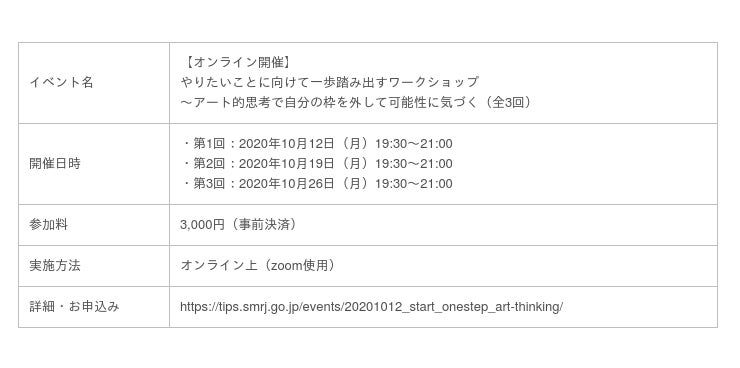 独立行政法人中小企業基盤整備機構(略称:中小機構、本部:東京都港区、理事長:豊永 厚志)創業・ベンチャー支援部 TIP*Sは、2020年10月12日から起業に関心がある方、新しい事業に取り組みたい中小企業の方にむけて、オンラインの対話型ワークショップ(全3回)を開催スタートします。