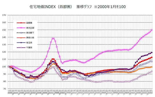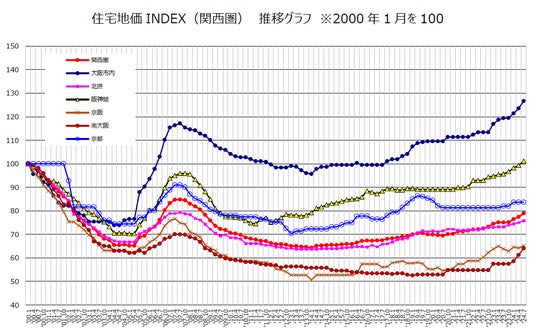 ・「住宅地価INDEX」は、当社独自の地価調査を指数化し、作成したものです。1989年7月よりスタートし、各店舗の営業エリアにおいて調査地点を選択し、通常取引を想定して実勢価格を査定しています。また対象エリアは首都圏、関西圏、名古屋の住宅地および商業地で、236の調査地点を設定しています(首都圏住宅地の調査地点数は169、関西圏の住宅地の調査地点数は40)。
