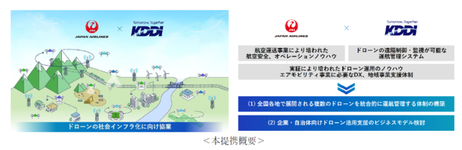 日本航空株式会社(本社:東京都品川区、代表取締役社長:赤坂 祐二、以下 JAL)、KDDI株式会社(本社:東京都千代田区、代表取締役社長:高橋 誠、以下 KDDI)は2022年2月15日に、ドローンの社会インフラ化に向け、運航管理の体制構築やビジネスモデルの共同検討に関する基本合意書を締結しました(以下 本提携)。