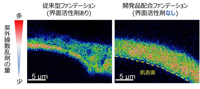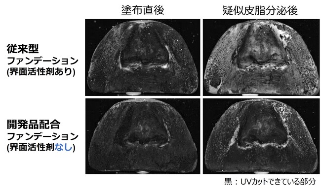 この開発品を用いて界面活性剤を含まないファンデーションを作製し、従来の界面活性剤を含むファンデーションとのUVカット効果を比較しました。実際の肌のような柔軟性をもつ鼻モデルにそれぞれのファンデーションを塗布し、時間をおいてから疑似皮脂を分泌させたところ、従来型の方では全体的にUVカット効果が大きく低下したのに対して、開発品の方は小鼻のまわりのみの効果低下に留まりました(図2)。