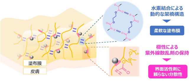そこで今回、肌負担のなさとUVカット効果を両立できる素材開発に取り組みました。着目したのは機能性をもたせた高分子素材の開発であり、高分子内にウレタン構造を持たせることにより、水素結合によって動的に架橋して皮膜に柔軟性を与える部位と、ウレタン構造のもつ極性(電気的な偏り)によって紫外線散乱剤を保持する部位を設計しました。これにより、柔軟な塗布膜と界面活性剤を用いない紫外線散乱剤の分散性をもつ、皮膜形成剤を開発しました(図1)。