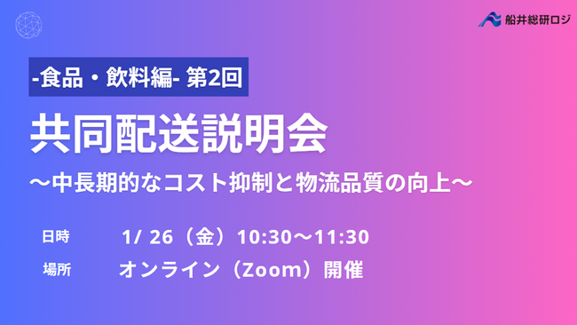 日本最大級のロジスティクス・物流コンサルティングファーム 船井総研ロジ株式会社(東京本社:東京都千代田区、代表:菅重宏、以下「船井総研ロジ」)は、2024年1月26日(金)10:30~11:30、荷主経営幹部または物流部門責任者を対象にした「第2回 ‐食品・飲料編‐共同配送説明会~荷主募集説明会~」をオンラインで開催いたします。