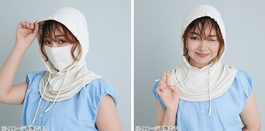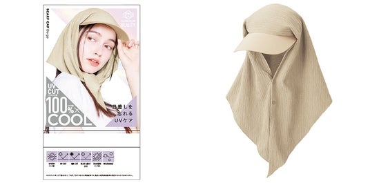 キャップとスカーフが一体化したドッキング仕様のアイテム 。バイザーに付いたサラッとした素材のスカーフが、首筋から顔周りまで広範囲をカバーします 。スナップボタンの留め方次第で、シーンに合わせた多彩な着こなしが可能です。