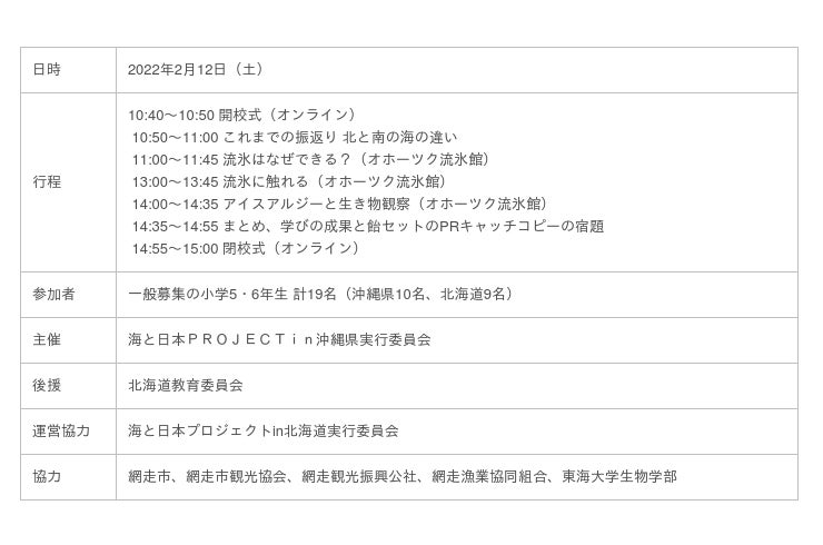 海と日本PROJECTin沖縄県実行委員会と海と日本プロジェクトin北海道実行委員会は、第3回オホーツク流氷調査隊を2月12日(土)に北海道網走エリアを舞台にオンライン形式で開催します。第2回の沖縄でのサンゴの海の調査に続く今回は、北海道のオホーツク海にやってくる流氷の観測や氷の下のアイスアルジーを現地からの映像と解説を交えながら調査します。沖縄からはしまうみ探検隊の10名、北海道からは第2回オホーツク流氷調査隊2021(主催:海と日本プロジェクトin北海道実行委員会)の9名がそれぞれ参加し、小学5・6年生合計19名がオンラインでひとつのチームとなって取り組みます。